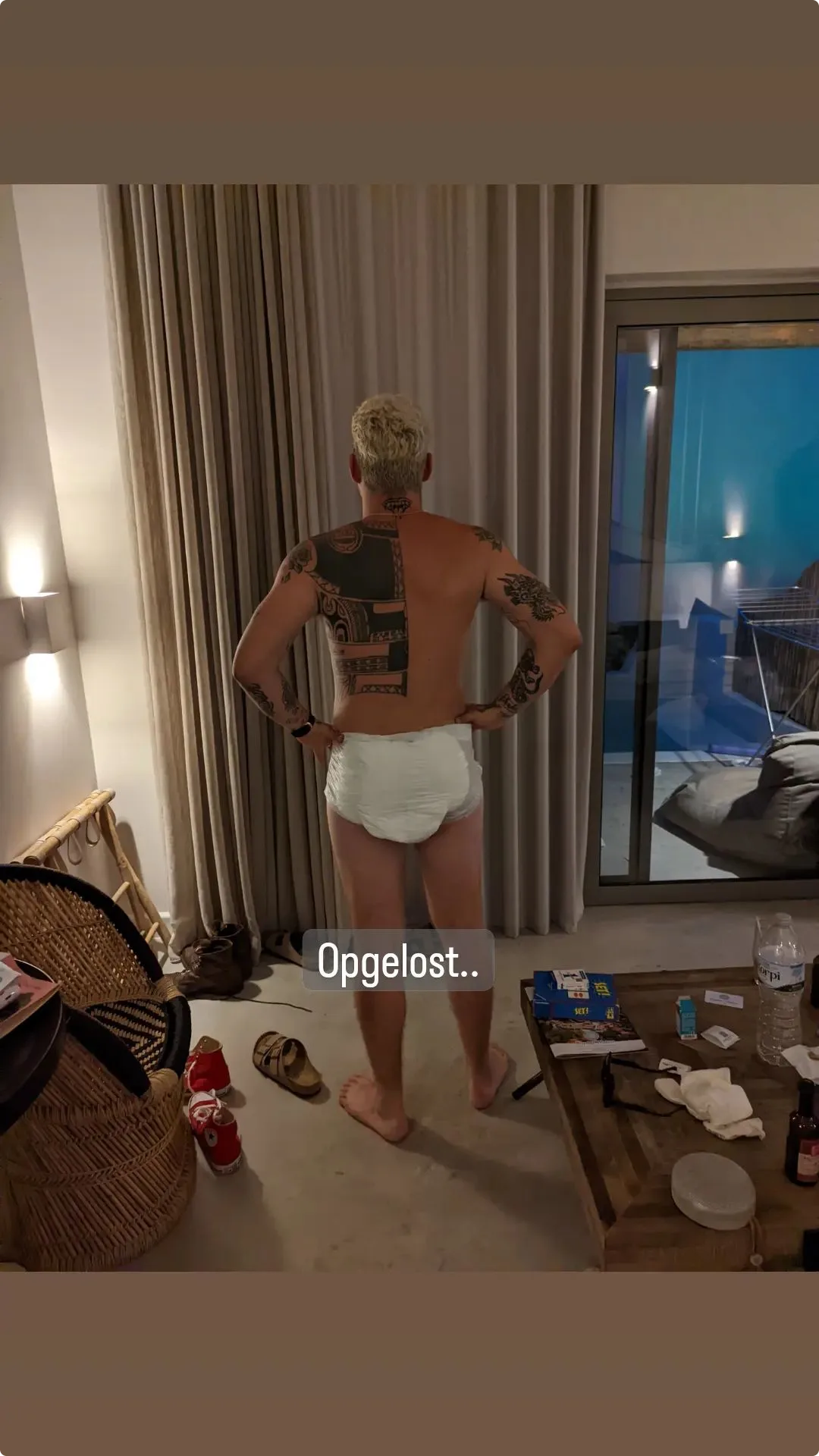 De zanger kocht een pak pampers die hij nodig heeft voor zijn zoontje Elias. Douwe bleek alleen niet goed naar de maat te hebben gekeken, want ze bleken veel te groot te zijn. De oplossing? Ze zelf aantrekken! Hoe dat eruit ziet, zie je in de foto hieronder.