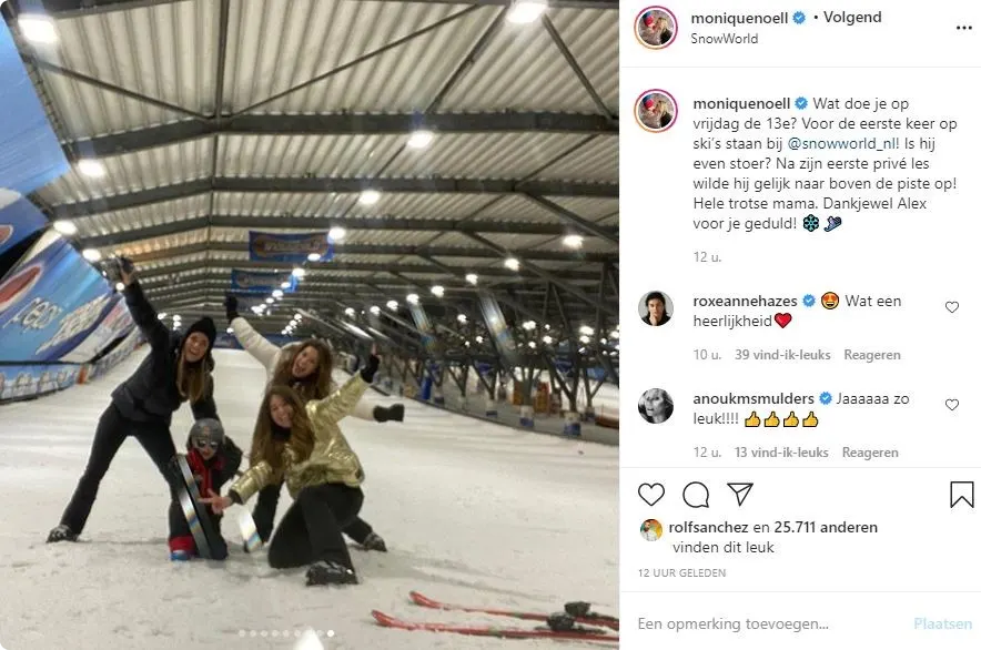 Zo deelt Monique op social media verschillende foto's en video's van zijn eerste les. Ze schrijft daarbij: "Wat doe je op vrijdag de 13e? Voor de eerste keer op ski’s staan bij Snowworld! Is hij even stoer? Na zijn eerste privé les wilde hij gelijk naar boven de piste op! Hele trotse mama."