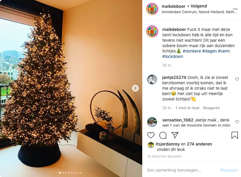 De volgers van Maik zijn onder de indruk van zijn versierde kerstboom. Zo schrijft iemand: "Oooh, ik zie al zoveel kerstbomen voorbij komen, dat ik me afvraag of ik straks niet te laat ben! Het ziet top uit! Heerlijk zoveel lichtjes!" Iemand anders reageert: "Jeetje Maik, denk wel 1 van de mooiste bomen in mijn beleving..."