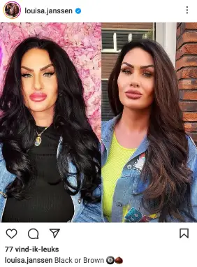 Even later deelt ze nog een voor- en nafoto. "Zwart of bruin", schrijft ze erbij.