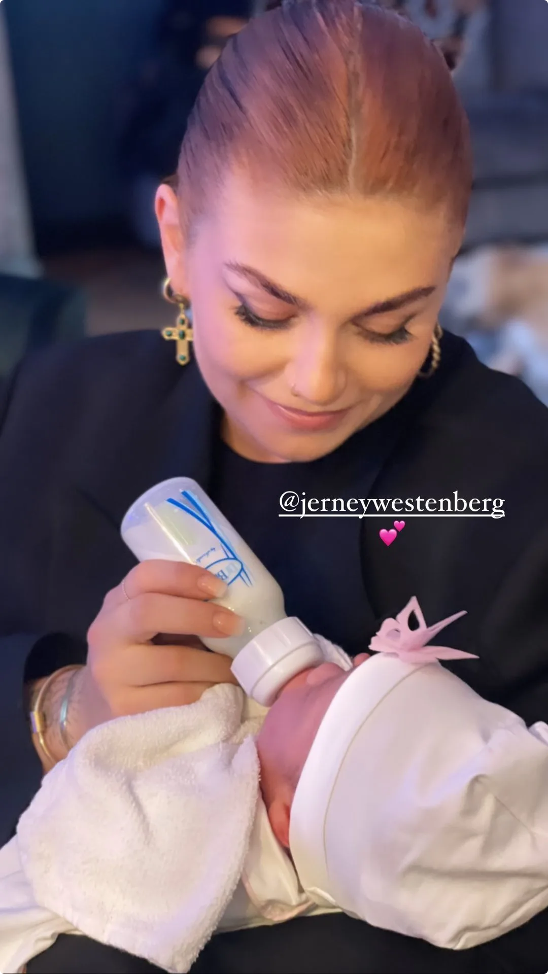 Op Instagram story is te zien hoe Roxeanne aanschuift bij de lunch voor de verjaardag van Monique en aan een flesje geeft aan de baby van de schoonzus van Monique.