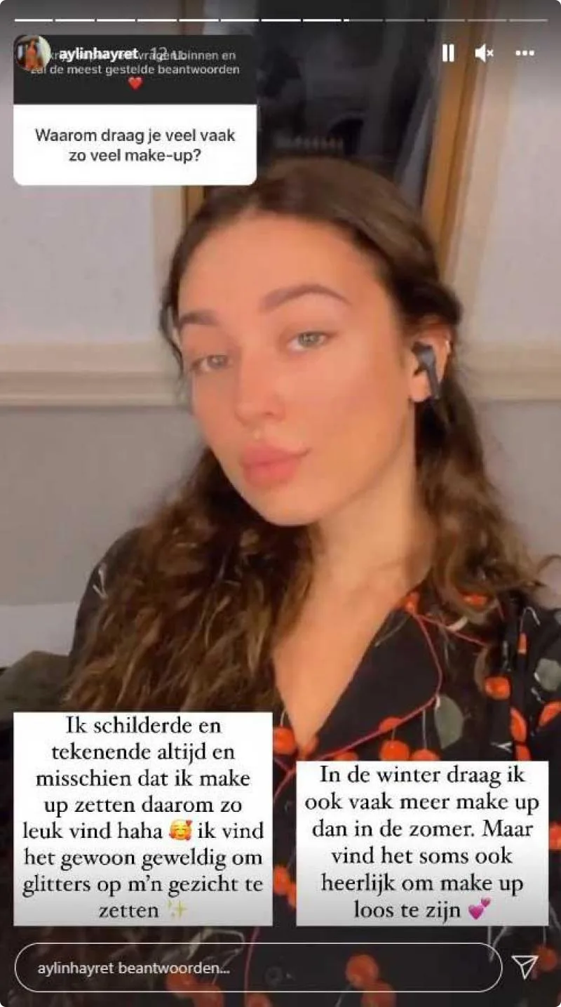 "In de winter draag ik ook vaak meer make-up dan in de zomer", vervolgt Aylin. "Maar ik vind het soms ook heerlijk om make-uploos te zijn." Toch wil ze wel laten zien hoe het eruit ziet als ze geen make-up draagt en daarom voegt ze er de volgende foto aan toe.