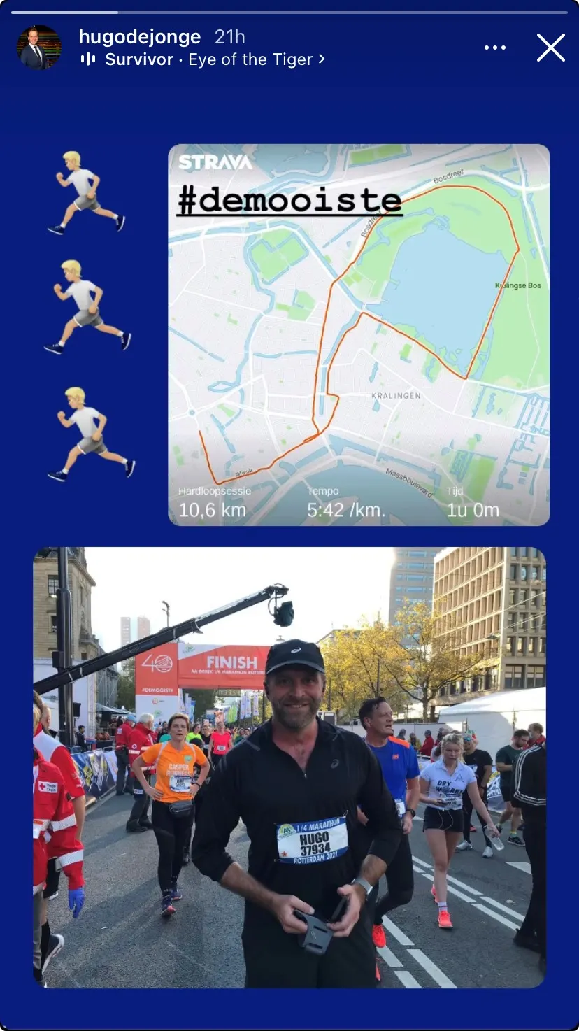 Op Instagram deelde de minister ook een foto van zijn sportieve prestatie. Daarnaast deelde de 44-jarige zijn eindtijd: over de ruim 10 kilometer deed hij precies een uur.