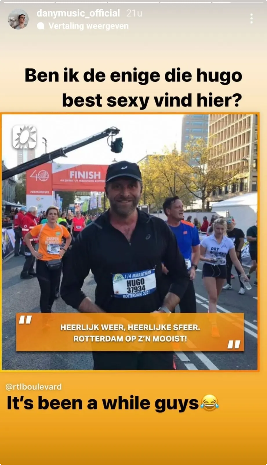 "Ben ik de enige die Hugo best sexy vind hier?" schrijft hij bij een foto van Hugo. "Het is al even geleden, jongens", verklaart hij zijn uitspraak.