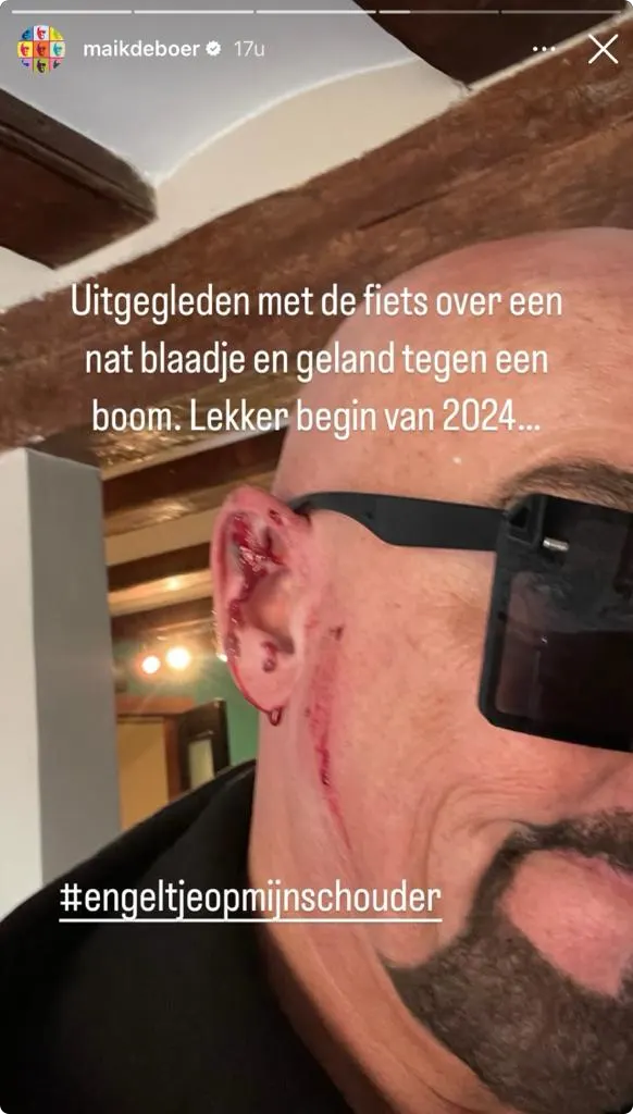 De stylist is maandag met de fiets gevallen in Barcelona. Hij liep daarbij een wond aan zijn oor op. "Uitgegleden met de fiets over een nat blaadje en geland tegen een boom. Lekker begin van 2024", schrijft Maik bij een foto van zijn bloedende oor. "Engeltje op mijn schouder."