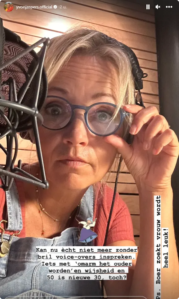 "Boer Zoekt Vrouw wordt heel leuk!" schrijft ze in de opnamestudio waar ze haar voice-overs voor het programma op tape zet. Hierbij deelt de presentatrice een foto van zichzelf met een bril op.