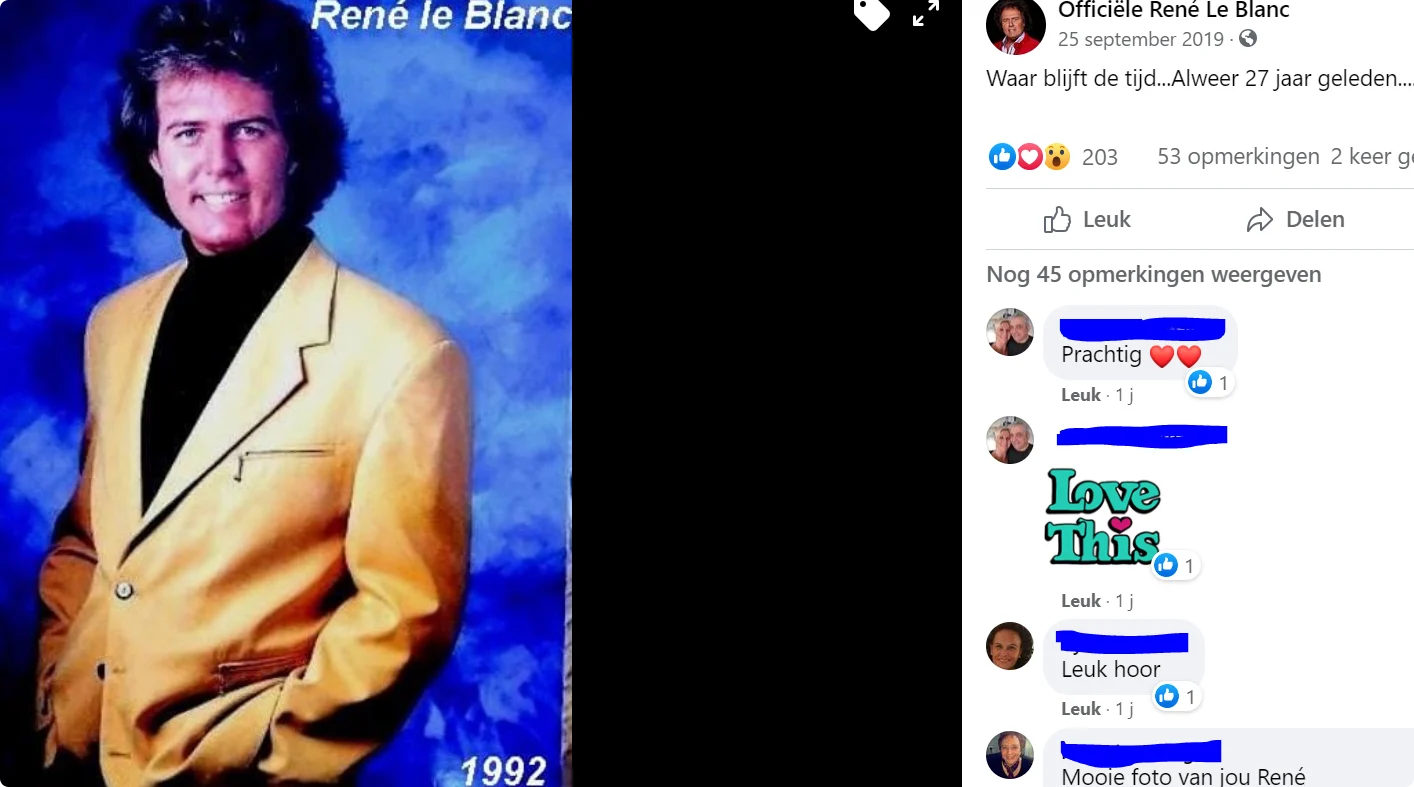 De If I Tell You-zanger deelde namelijk een foto van alweer bijna dertig jaar geleden. In 1992, toen de zanger 23 was, poseerde hij namelijk voor de onderstaande foto. "Waar blijft de tijd, alweer 27 jaar geleden", schreef René erbij.