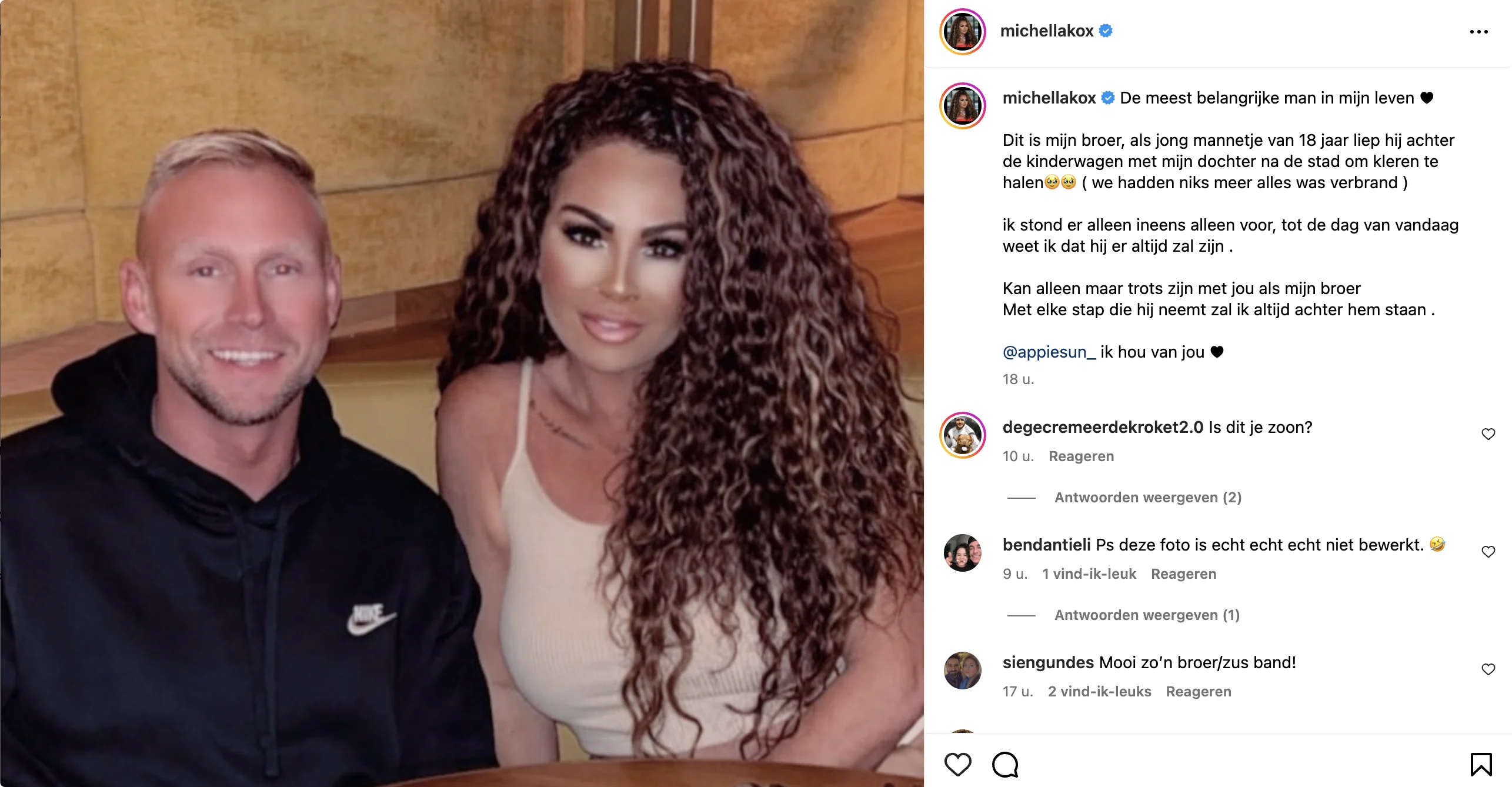 Michella Kox deelt niet vaak beelden van haar eigen familie. Deze week plaatst de realityster, die onlangs nog in Echte Meisjes in de Jungle was te zien (zie video), een liefdevol kiekje samen met haar broer Appie op sociale media en stelt ze hem aan haar volgers voor.