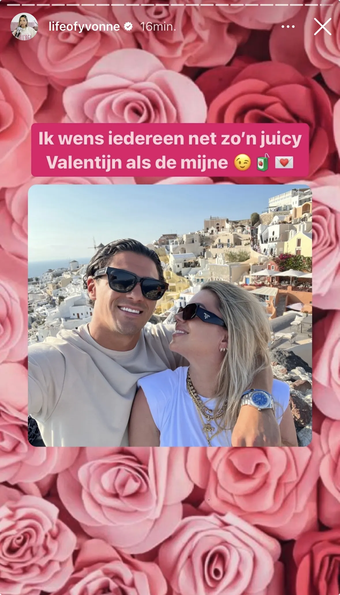 "Ik wens iedereen net zo'n juicy Valentijn als de mijne", zo schrijft Yvonne in haar Instagram Stories bij een foto samen met haar vriend Max Vieleers. Yvonne heeft eerder al beelden gedeeld waar Max opstond, maar dan zonder gezicht. De foto van de tortelfuifje lijkt gemaakt te zijn tijdens hun vakantie in Griekenland.