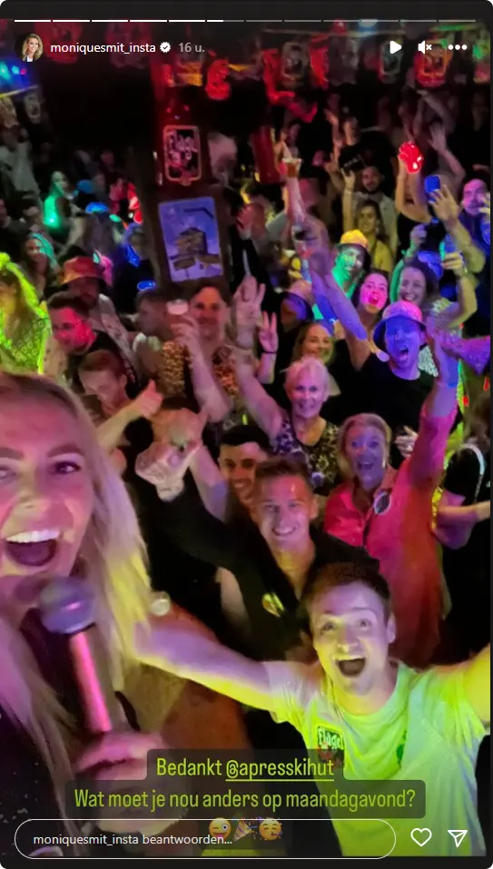"Wat moet je nou anders op maandagavond?", grapt Monique in haar Instagram Stories, waar ze een aantal foto's plaatst van de hysterische avond. Eén ding is zeker, het ziet er onwijs gezellig uit.