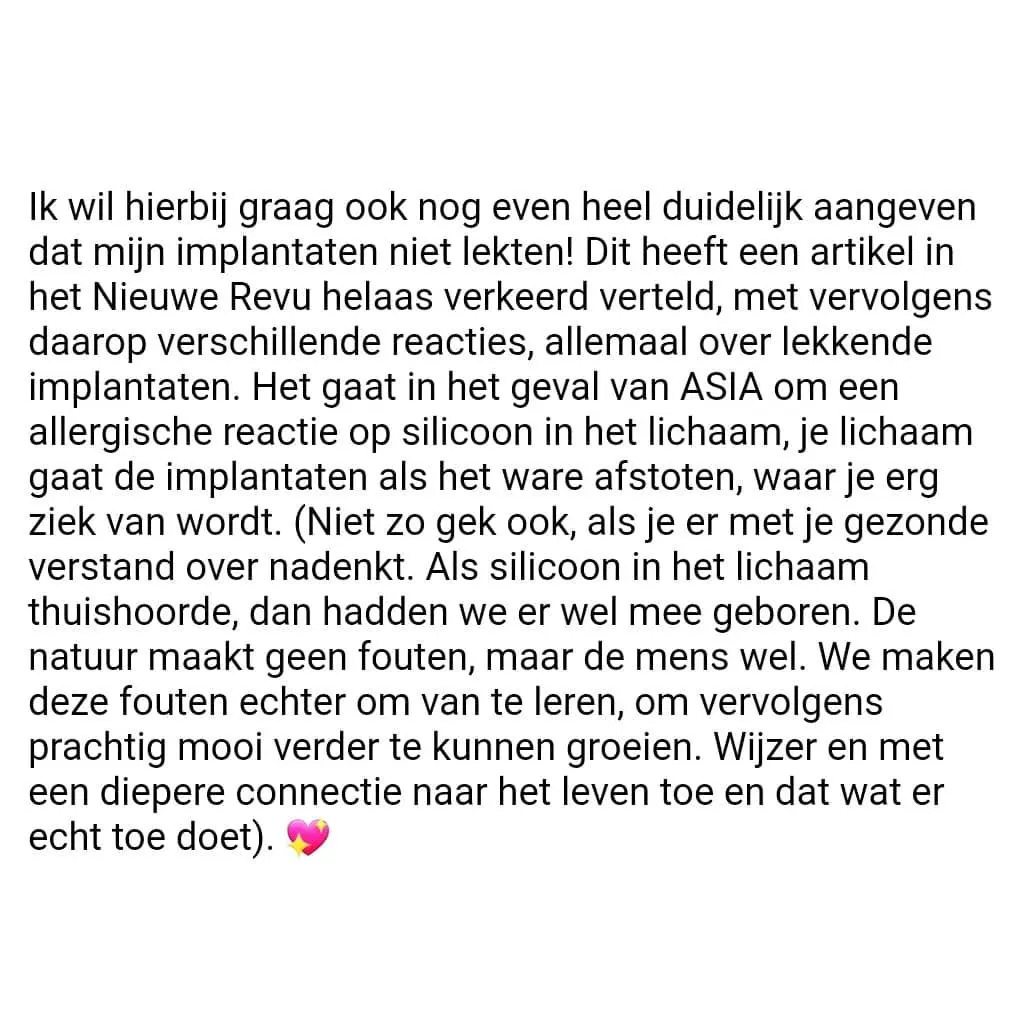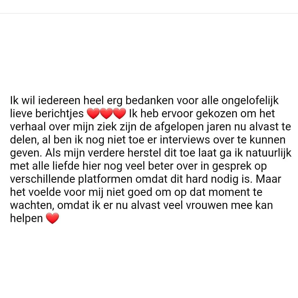 Zo laat ze weten: "Ik wil iedereen bedanken voor alle ongelooflijk lieve berichtjes. Ik heb ervoor gekozen om het verhaal over mijn ziek zijn de afgelopen jaren nu alvast te delen, al ben ik nog niet toe er interviews over te kunnen geven. Als mijn verdere herstel dit toelaat ga ik natuurlijk met alle liefde hier nog veel beter over in gesprek op verschillende platformen omdat dit hard nog is. Maar het voelde voor mij niet goed om op dat moment te wachten, omdat ik er nu alvast veel vrouwen mee kan helpen."