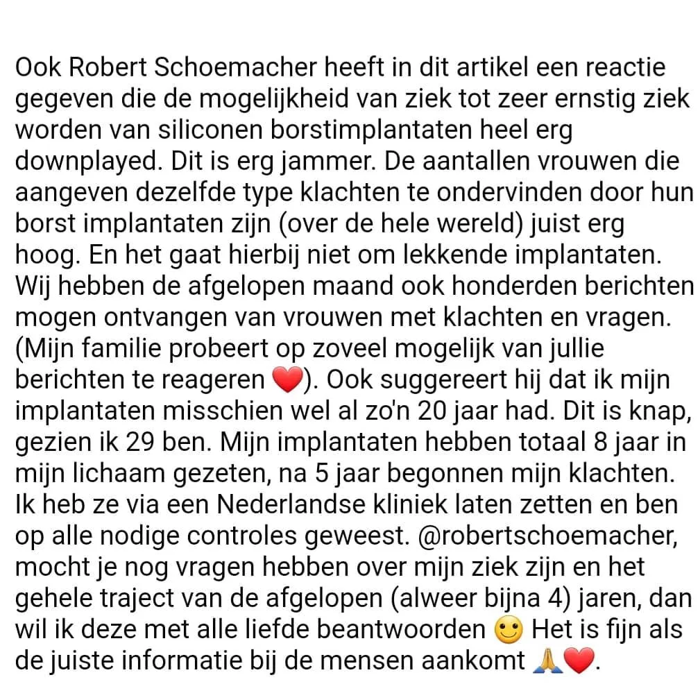 Veel volgers sluiten zich aan bij het statement van Zimra. "Prachtig gezegd lief. Trots op jou! ♥️♥️♥️", "Mooi ❤️ Heel veel beterschap Zimra!" en "Zo waar💗 Een heel goed herstel toegewenst. Ik heb helaas dezelfde ziekte en sta op de wachtlijst voor explantatie. Zou dolgraag met lotgenoten in contact komen.💕", wordt er onder andere geschreven. De post is hieronder terug te lezen.