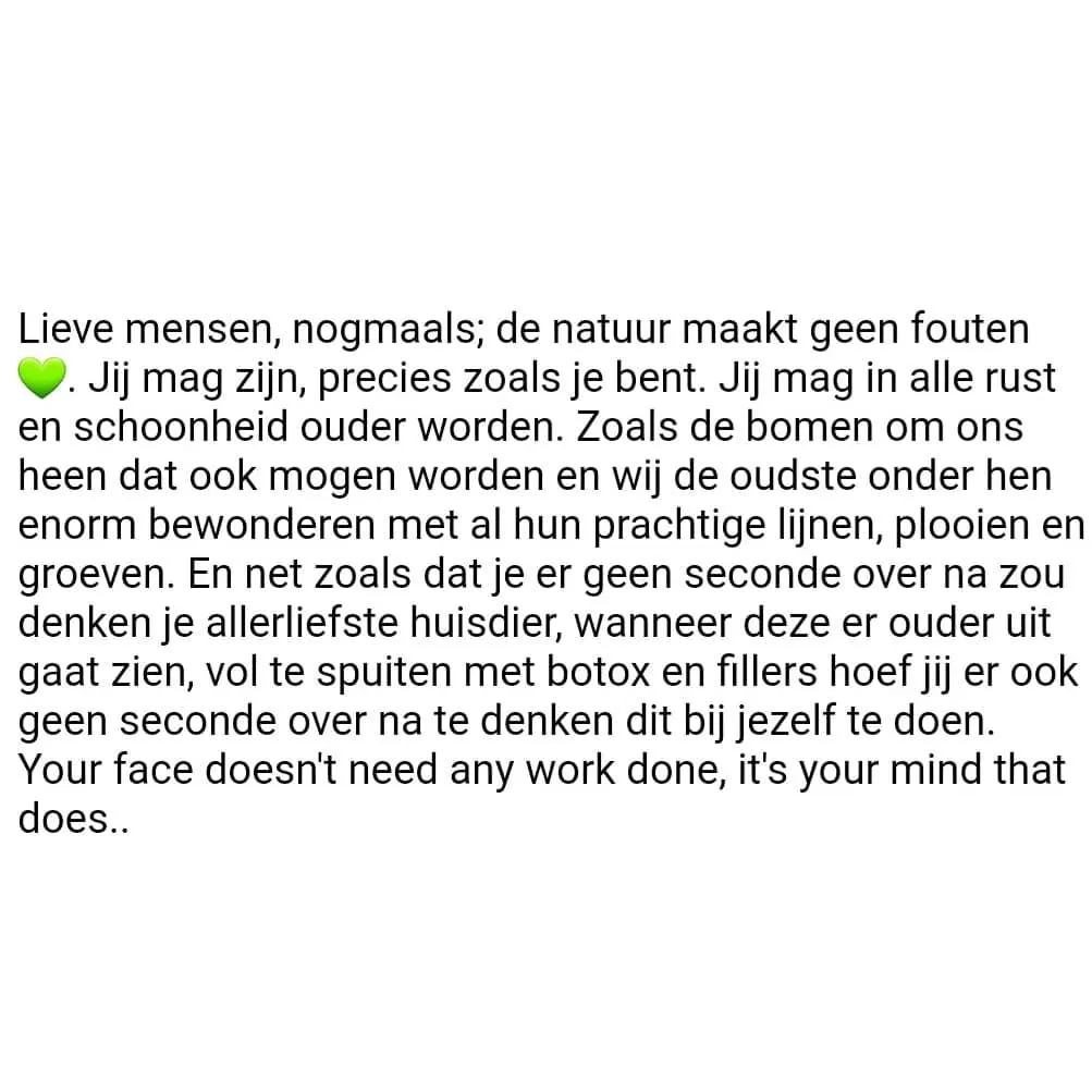 "En net zoals dat je geen seconde over na zou denken je allerliefste huisdier, wanneer deze er ouder uit gaat zien, vol te spuiten met botox en fillers, hoef jij er ook geen seconde of na te denken dit bij jezelf te doen. Your face doesn't need any work done, it's your mind that does...", sluit het model af.