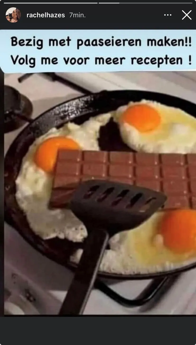 Rachel Hazes is de zondag begonnen met wel heel bijzondere eieren, zo is te zien op de foto hieronder. Ze deelt een plaatje van drie spiegeleieren in een pan met daarop een chocoladereep. Ze schrijft er zelf bij: ''Bezig met paaseieren maken! Volg me voor meer recepten!''
