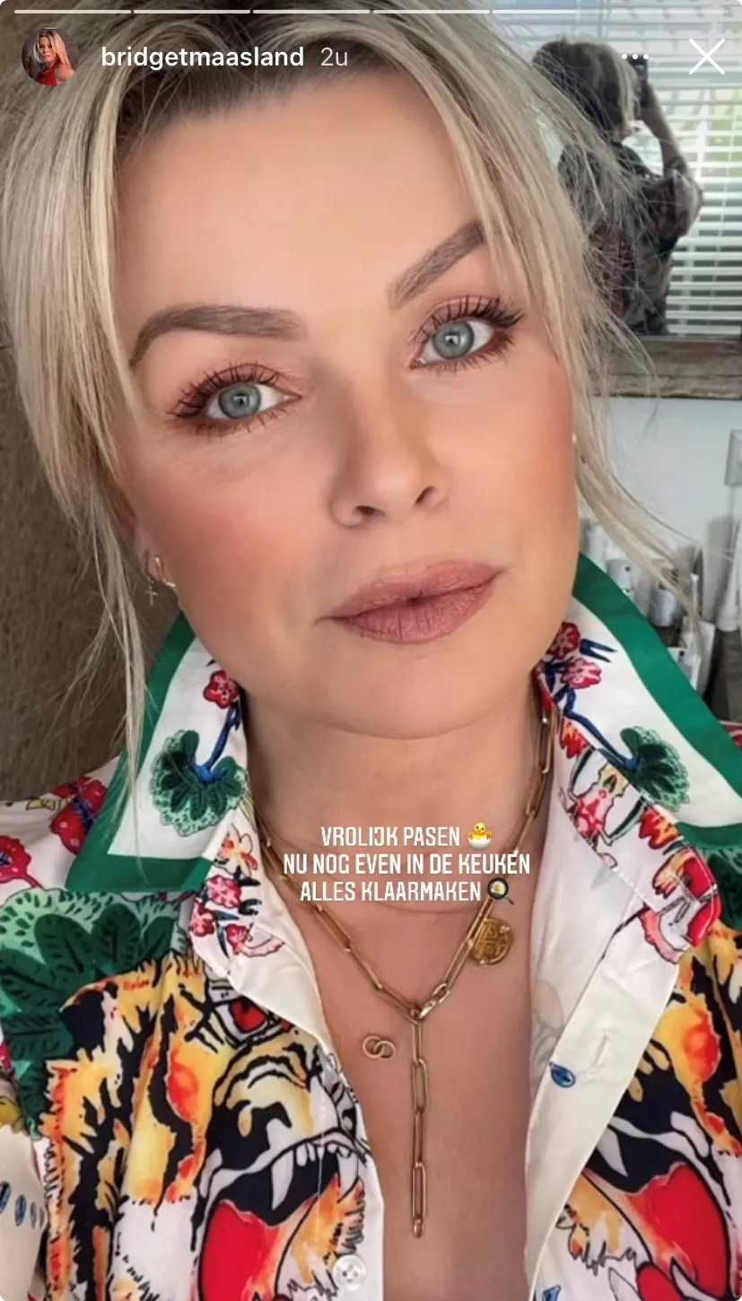 Presentatrice Bridget Maasland zit zondagochtend al volledig in de make-up. Ze deelt een kleurrijk kiekje en schrijft daarbij: ''Vrolijk Pasen. Nu nog even in de keuken, alles klaarmaken.''