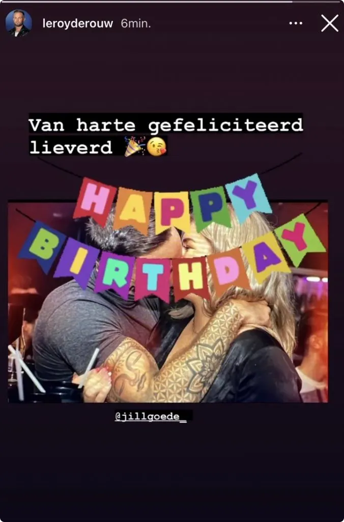 Bij 'HAPPY BIRTHDAY' schrijft Leroy namelijk "Van harte gefeliciteerd, lieverd." Daar voegt hij een dikke kus aan toe. Via een emoji, maar ook met een foto waarop dit al eens eerder gebeurde!