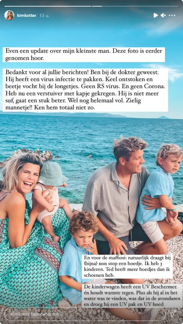 Terwijl het gezin op vakantie is, is een doktersbezoekje met de kleine man hen helaas niet bespaard gebleven. "Ben bij de dokter geweest. Hij heeft een virus infectie te pakken. Keel ontstoken en beetje vocht bij de longetjes," schrijft Kim. "Geen RS-virus. En geen Corona," staat erbij.