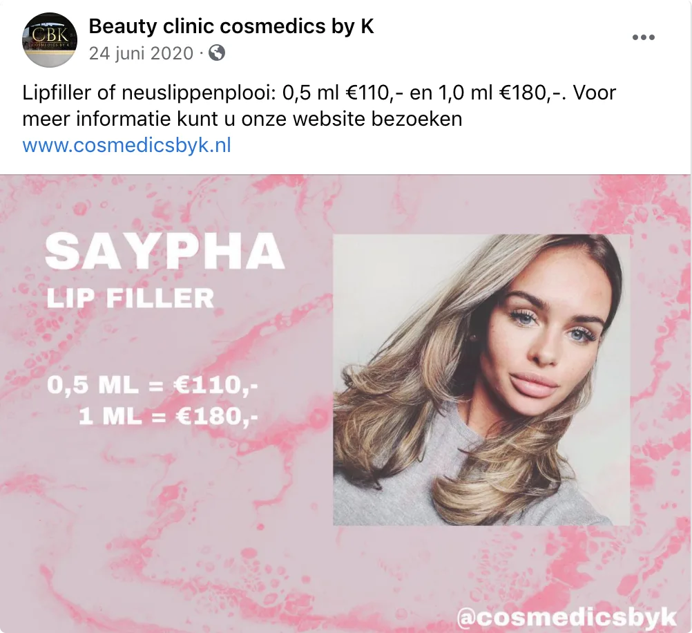Ook hieronder is te zien hoe Sarah een ingreep aanprijst en wat die zou kosten.