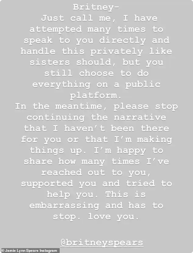 Jamie Lynn beweert dan weer dat ze er altijd alles aan heeft gedaan om haar tien jaar oudere zus te helpen onder het toezicht uit te komen. In haar aan Britney gerichte post dit weekend zegt ze: "Stop alsjeblieft met het verhaal dat ik er niet voor je ben geweest of dat ik dingen verzin. Ik deel met liefde hoe vaak ik contact met je heb gezocht, hoe ik je heb gesteund en hoe ik geprobeerd heb je te helpen. Dit is gênant en het moet stoppen. Ik hou van je."