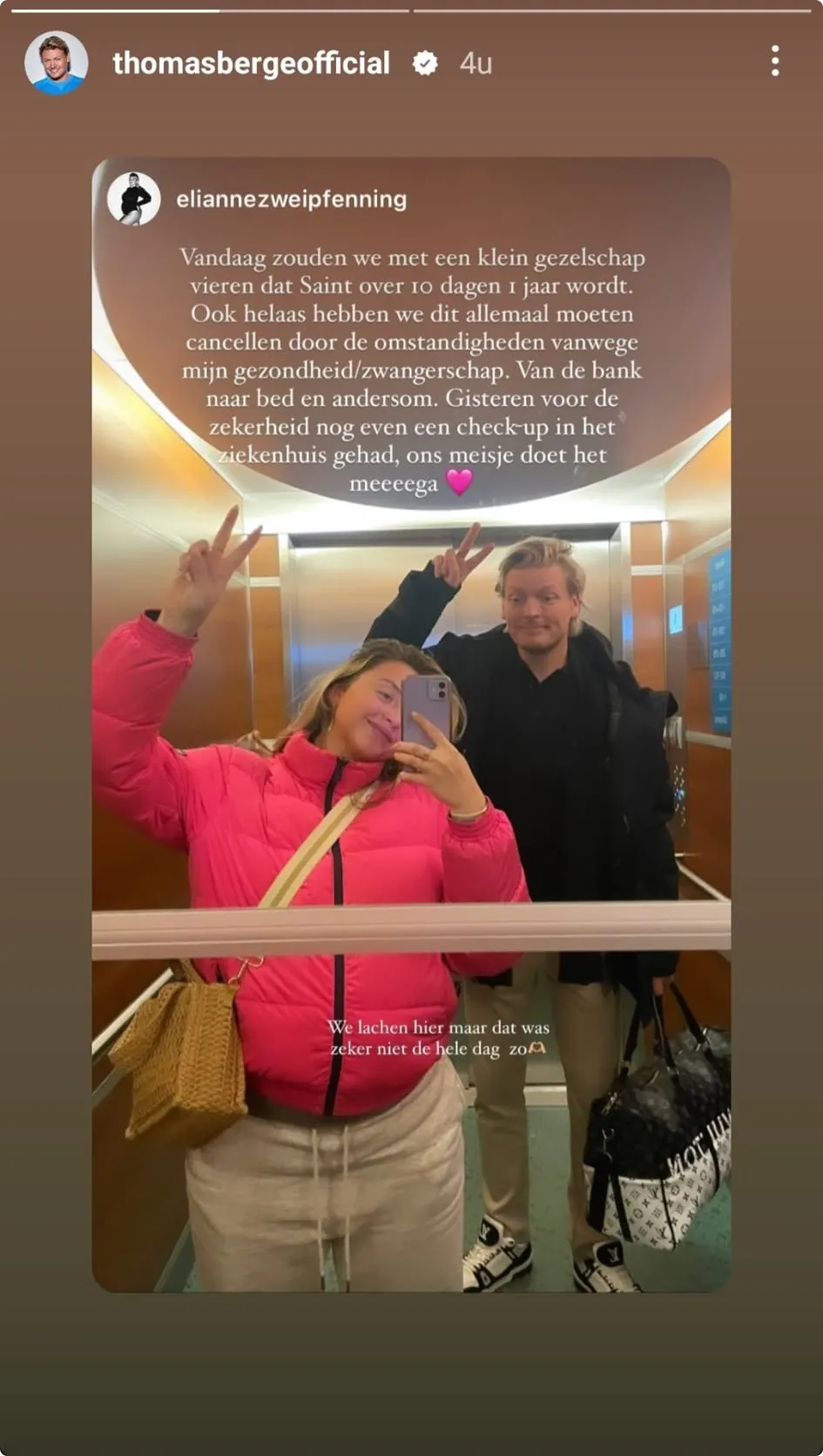 Thomas Berge en zijn zwangere vriendin Elianne delen vervelend nieuws zaterdag. Door omstandigheden vanwege haar gezondheid/zwangerschap (zie video) hebben ze het verjaardagsfeestje van hun zoontje Saint moeten afzeggen...