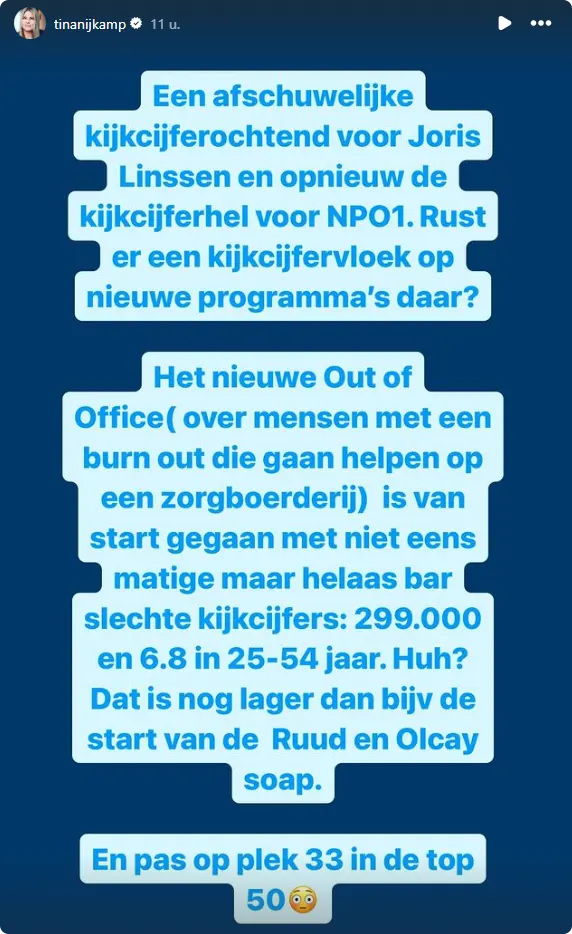 “Een afschuwelijke kijkcijferochtend voor Joris Linssen en opnieuw de kijkcijferhel voor NPO1. Rust er een kijkcijfervloek op nieuwe programma’s daar?”, aldus Tina Nijkamp op Instagram. Er keken dinsdag maar 299.000 mensen naar de eerste aflevering Out of Office. En dat is met een populaire programma Ik Vertrek ervoor niet heel goed.