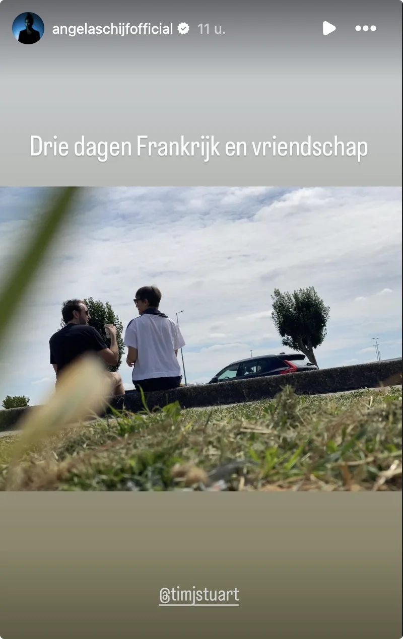 "Drie dagen Frankrijk en vriendschap", zo valt er te lezen in de Instagram Stories bij een foto van een grasveld met een auto erachter. Ze is met een vriend genaamd Tim op reis geweest.