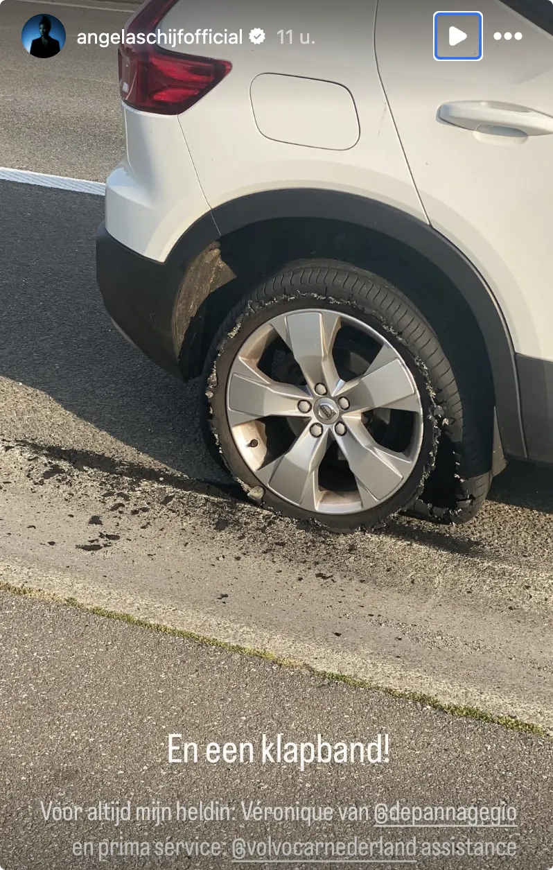 Angela Schijf heeft een heerlijke vakantie in Frankrijk achter rug zitten. Op sociale media deelt de actrice, die dit jaar onder meer schitterde als Maria in The Passion (zie video), dat een band van haar auto tijdens de rit terug naar huis is geklapt.