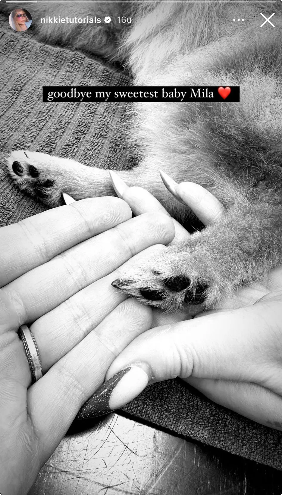 Nikkie plaatst een foto in haar Instagram-verhaal waarop ze het pootje van haar hondje Mila vasthoudt. Uit de bijbehorende caption blijkt dat Mila is overleden. Nikkie schrijft: "Goodbye allerliefste baby Mila."