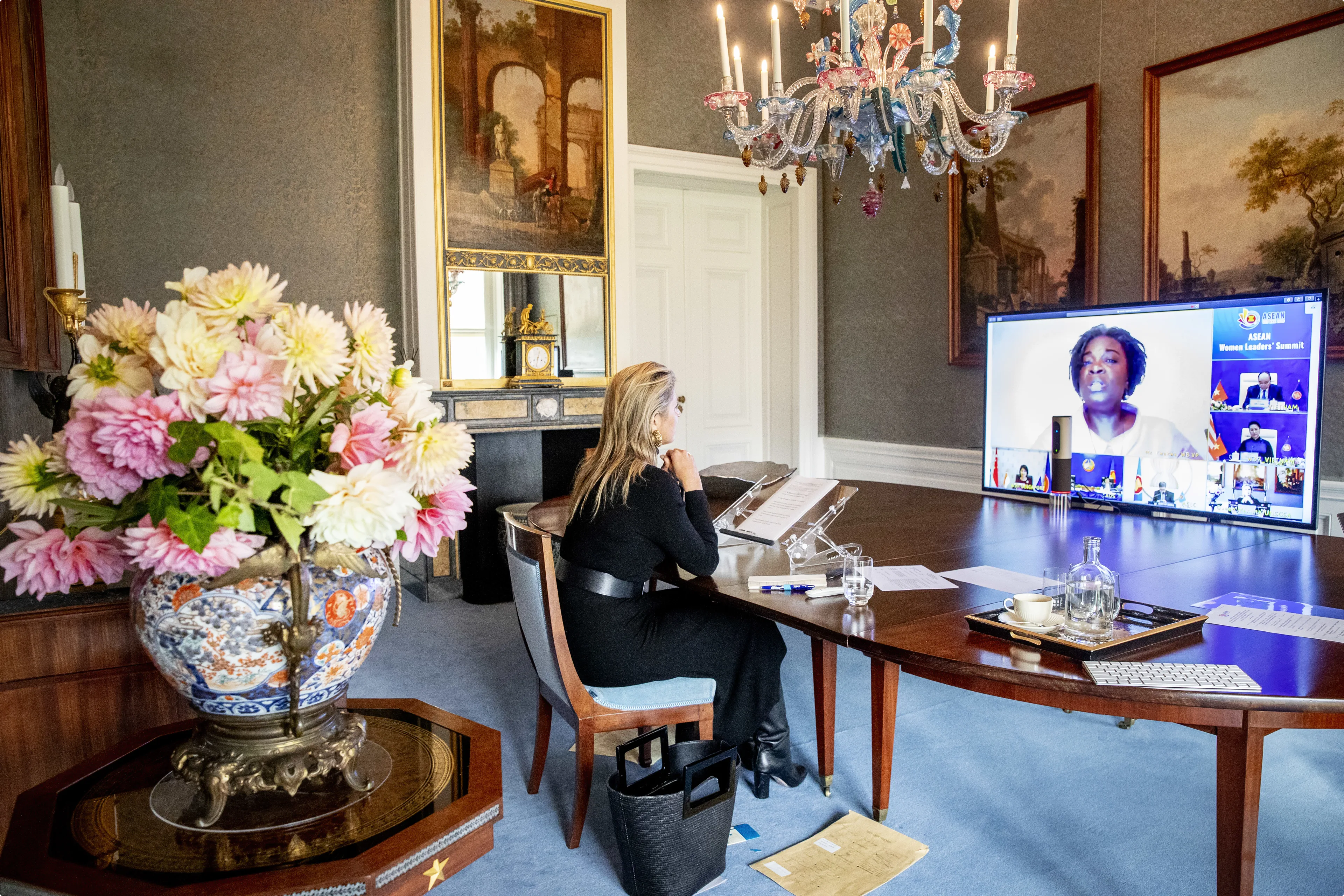 Koningin Máxima heeft donderdag twee online werkgesprekken gevoerd vanuit haar nieuw ingerichte videobelstudio in Paleis Huis ten Bosch. Ze sprak met medewerkers van financiële instellingen die een training volgden bij het Nationaal Instituut voor Budgetvoorlichting (Nibud). Die instantie helpt mensen onder meer met geldzaken en geeft adviezen op dat gebied.