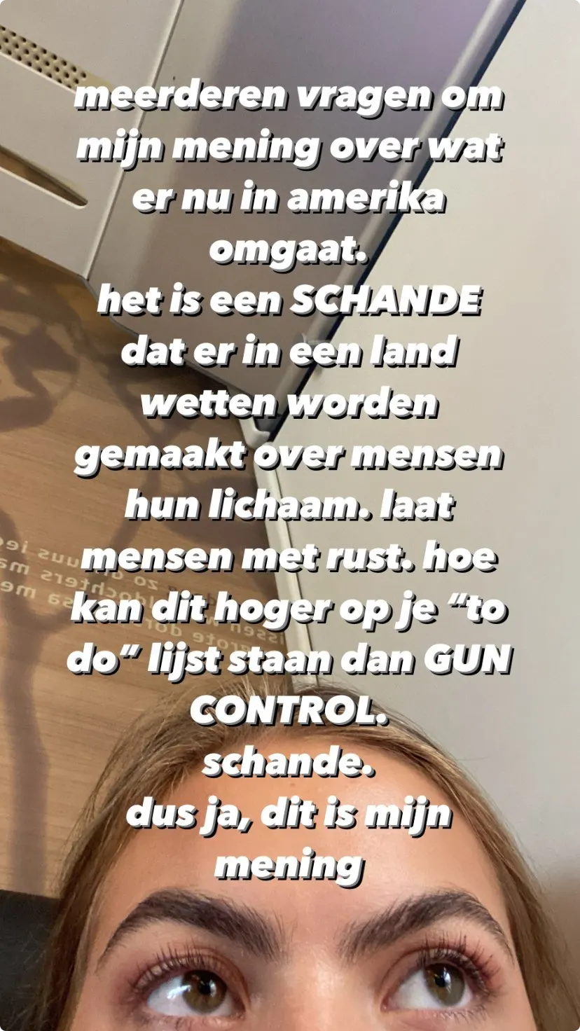 "Meerderen vragen om mijn mening over wat er nu in Amerika omgaat", steekt Eloise haar verhaal zondag af in haar Instagram Story, na eerder al een paar berichten van anderen die tegen het besluit zijn te hebben gedeeld. "Het is een SCHANDE dat er in een land wetten worden gemaakt over mensen hun lichaam. Laat mensen met rust."