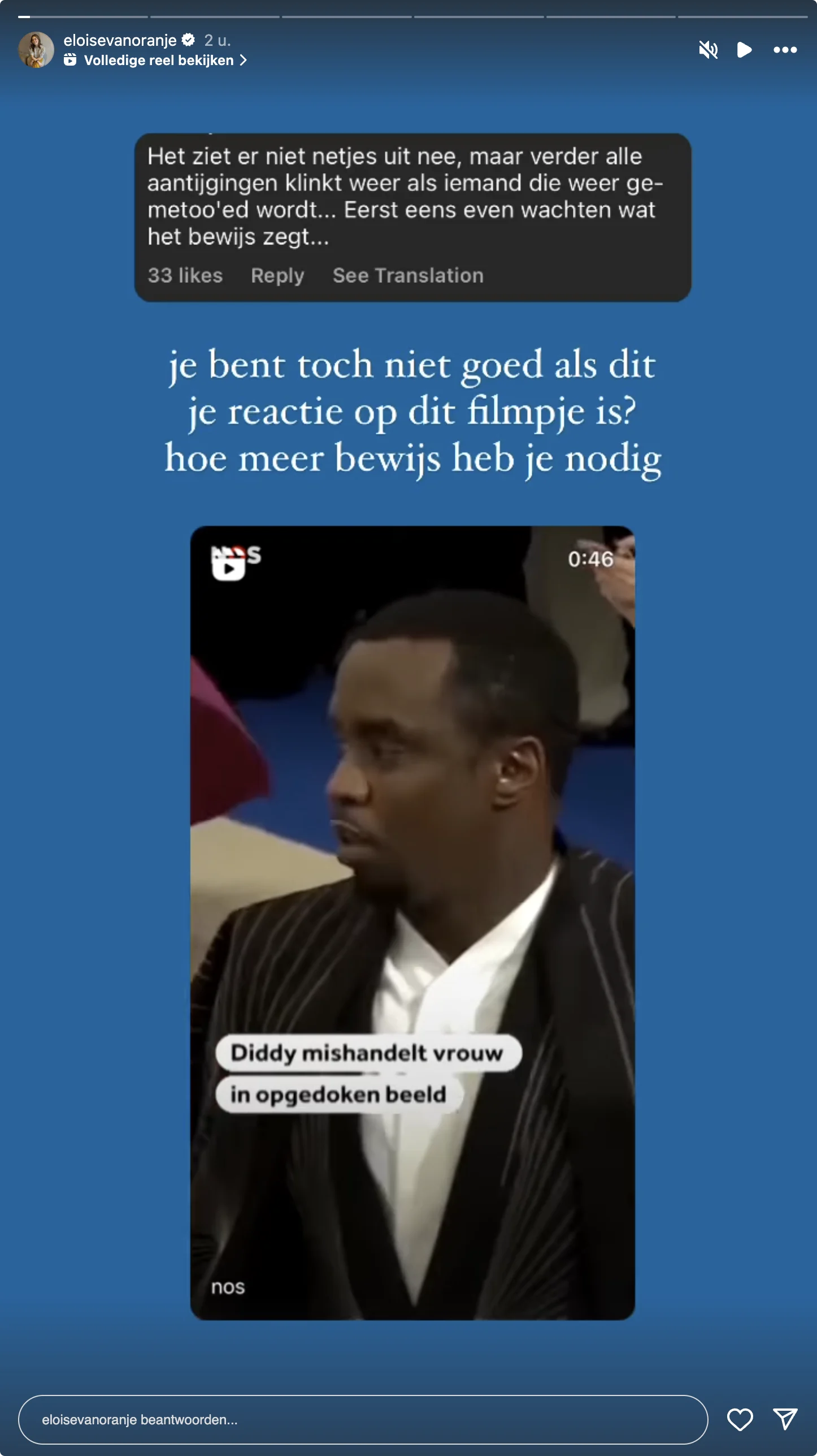 Eloise heeft het over een reactie op een video van de NOS. "Het ziet er niet netjes uit nee", schrijft iemand, die daarop wel benoemt dat het klinkt als iemand "die weer gemetoo'd" wordt. "Eerst eens even wachten wat het bewijs zegt", schrijft diegene. Deze reactie leidt tot grote onvrede bij de gravin.