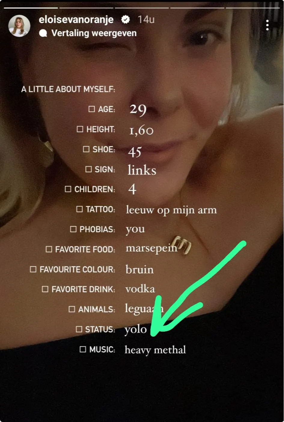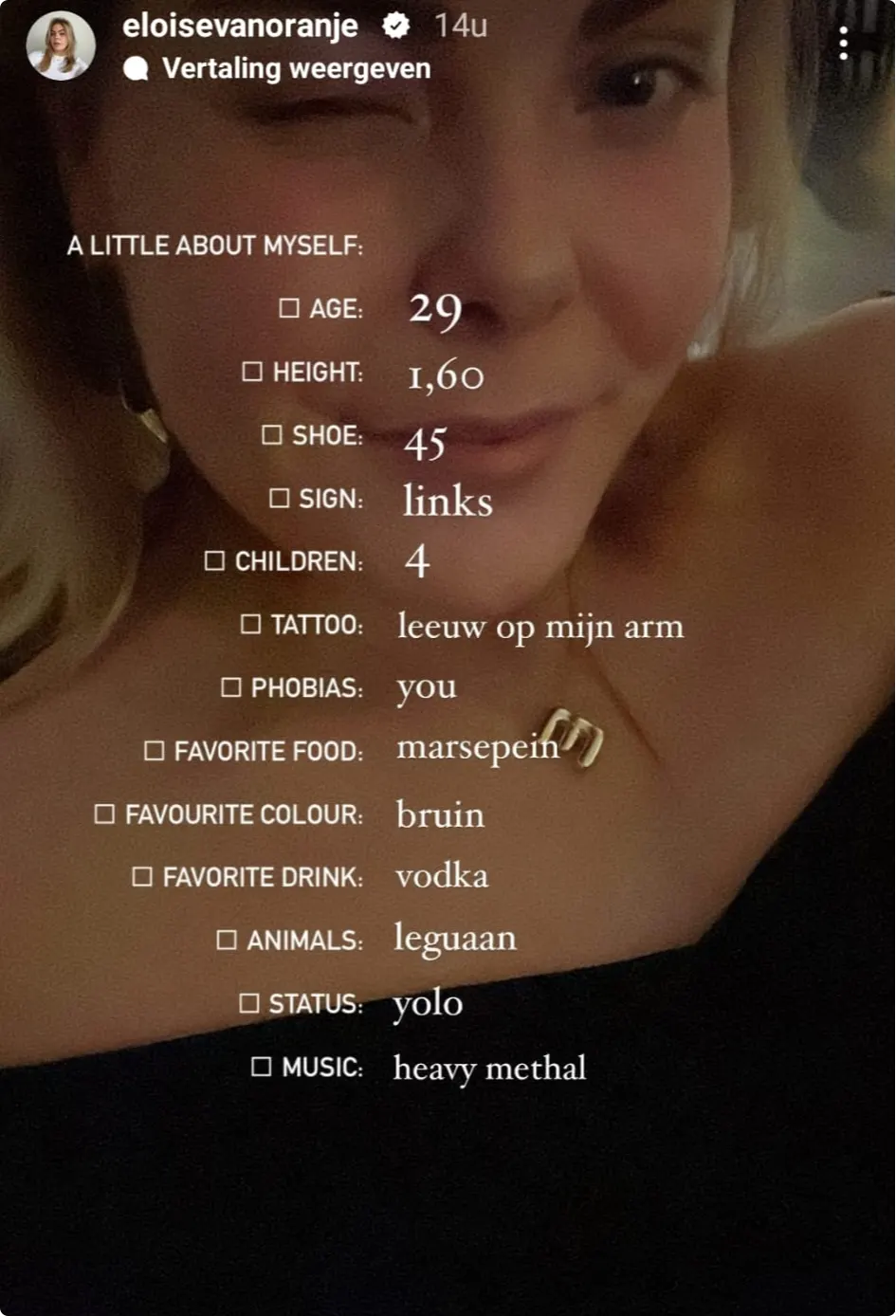 De afgelopen dagen plaatsen veel bekende Nederlanders een lijst met persoonlijke informatie op Instagram. Hierop delen ze details zoals hun leeftijd, schoenmaat, favoriete eten/drinken, muzieksmaak en relatiestatus. Eloise deelt ook zo'n lijst in haar Instagram-Story, maar verrast haar volgers met opvallende antwoorden. Zo geeft ze aan 29 jaar te zijn met schoenmaat 45, en deelt ze haar relatiestatus met de vermelding: "Je leeft maar één keer." Dit zorgt voor veel verwarring onder haar volgers.