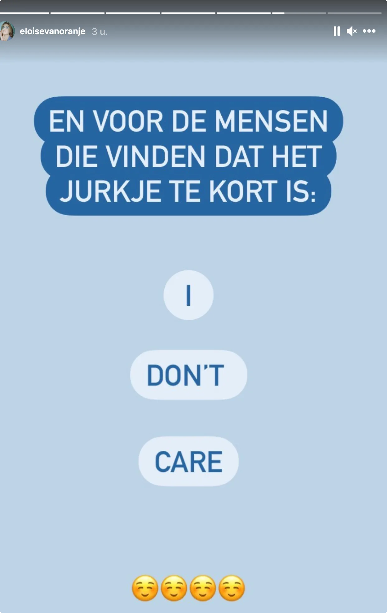 Zo deelde Eloise rond de jaarwisseling opnamen van zichzelf met jongere zus Leonore en met de kennelijk even uit Schotland overgewipte broer Claus. Ook de hapjes en drankjes van de jaarwisseling kwamen voorbij, alsmede een weinig verhullend jurkje. Eloise was daarbij alle eventuele kritiek van fans voor. "Voor de mensen die vinden dat het jurkje te kort is: I dont care"- kan me niet schelen.