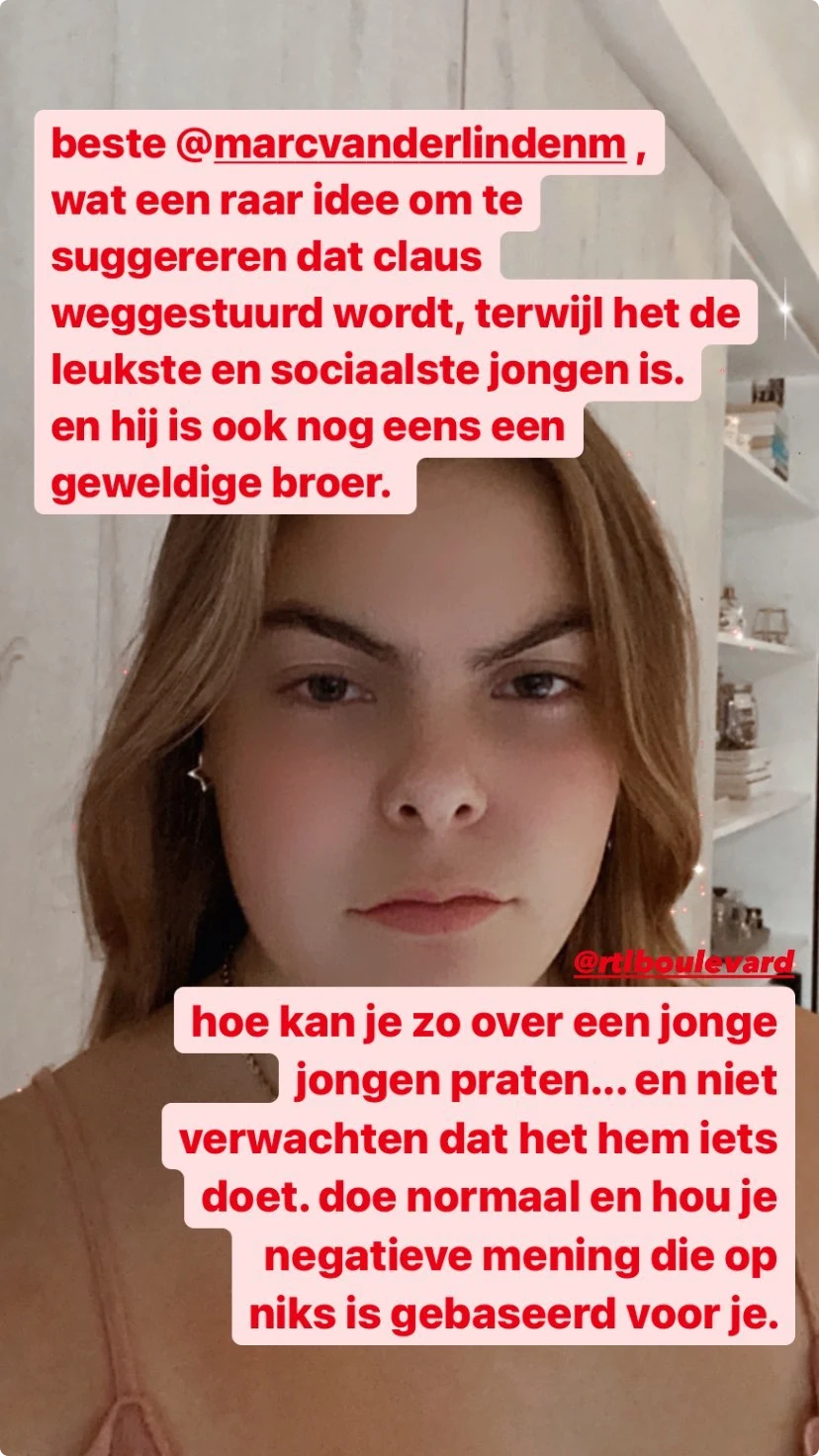 "Beste Marc van der Linden, wat een raar idee om te suggereren dat Claus weggestuurd wordt, terwijl het de leukste en sociaalste jongen is. En hij is ook nog eens een geweldige broer", schrijft de 18-jarige Eloise op Instagram. "Hoe kan je zo over een jonge jongen praten... en niet verwachten dat het hem iets doet. Doe normaal en hou je negatieve mening die op niks is gebaseerd voor je."