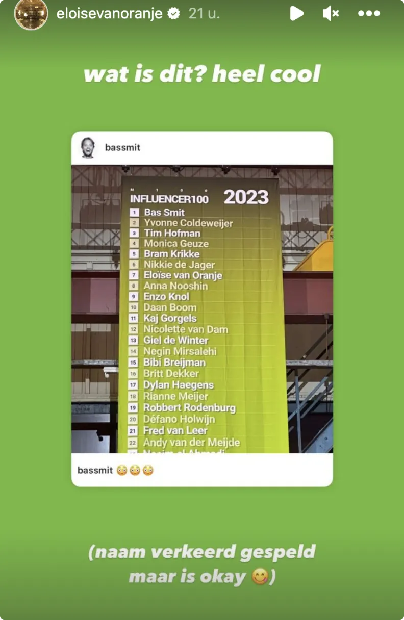 Bas Smit deelde de lijst als story op zijn Instagram. Daarnaast ving Yvonne Coldeweijer de lijst op als een groots compliment...Ook gravin Eloise staat aardig hoog op de lijst: namelijk plek zeven. Alleen weet de gravin niet precies wat ze met de lijst moet. Zo reageert ze op de post van Bas Smit met "Huh wat is dit?" Waarna ze haar volgers om hulp vroeg. Ze deelde het bericht van Bas en schreef daarbij: "Wat is dit? heel cool", en "Naam verkeerd gespeld maar is okay."
