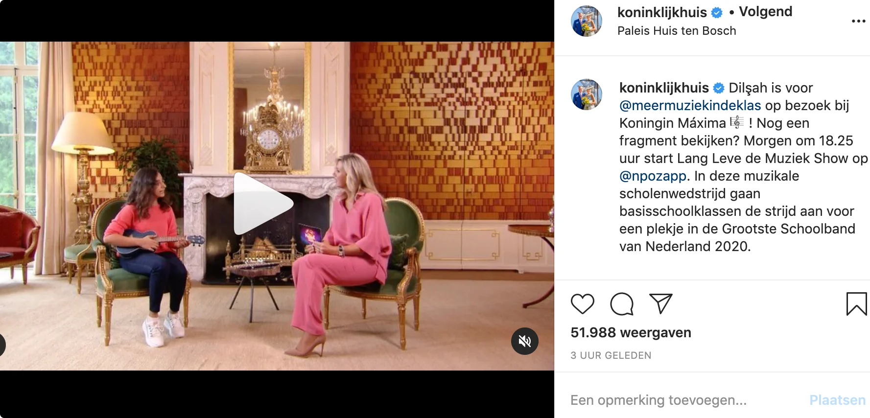 De koningin is erevoorzitter van Meer Muziek In de Klas, een stichting die pleit voor meer aandacht voor muziek in het onderwijs. Op een filmpje op Instagram is te zien dat Máxima onder de indruk is van de muzikale kwaliteiten van Dilşah. "Wat zing je prachtig", krijgt het meisje te horen nadat ze True Colors van Phil Collins had gespeeld. Dilşah zelf geeft aan het "heel spannend" te vinden.