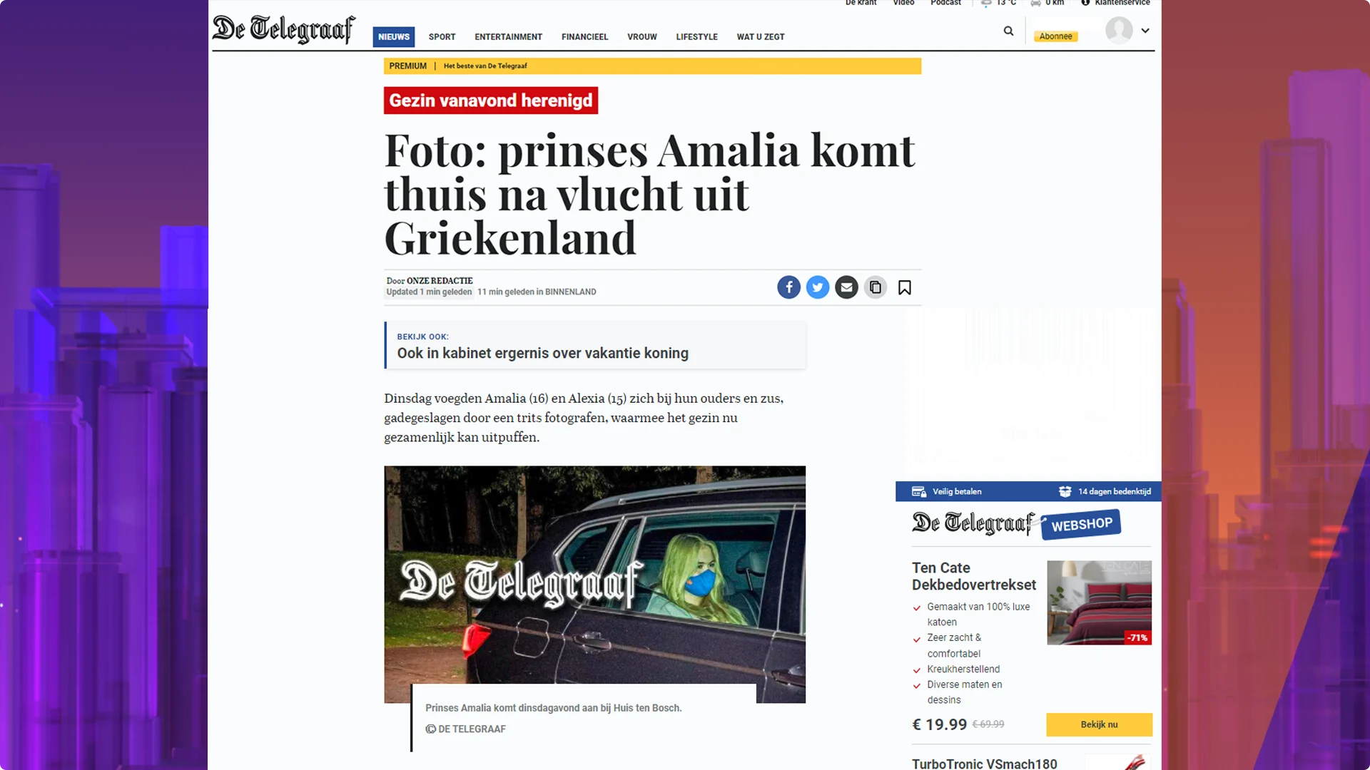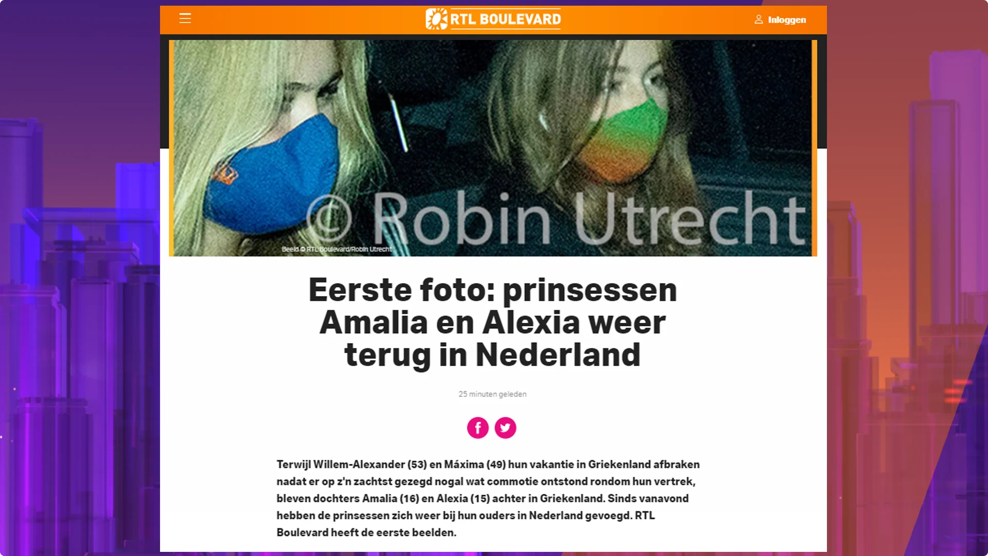 De oudste dochters van koning Willem-Alexander en koningin Máxima arriveerden per auto bij paleis Huis ten Bosch. Anders dan hun vader zaterdag droegen beiden een mondkapje, zo is te zien op foto's die De Telegraaf en RTL Boulevard publiceren. Alexia's mondkapje is van Jan Taminiau en kost 45 euro.