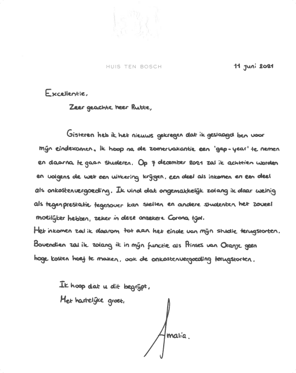 In een brief aan Mark Rutte laat Amalia weten dat ze afziet van de uitkering. "Zeer geachte heer Rutte, gisteren heb ik het nieuws gekregen dat ik geslaagd ben voor mijn eindexamen. Ik hoop na de zomervakantie een 'gap-year' te nemen en daarna te gaan studeren", is te lezen in de handgeschreven brief die de Rijksoverheid vrijdagmiddag publiceert.