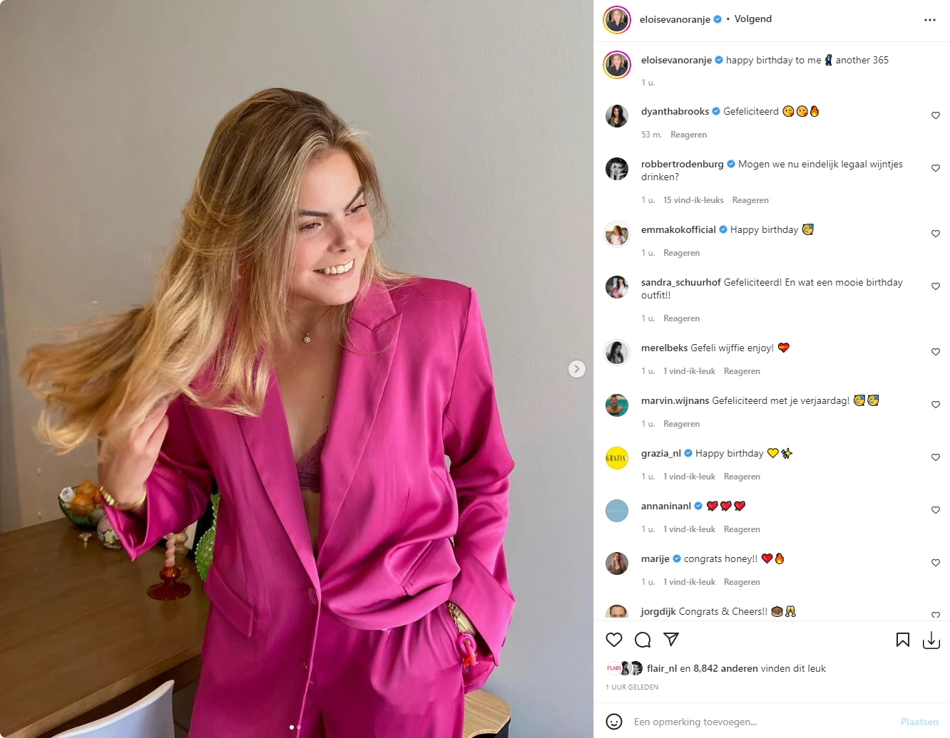 Gravin Eloise heeft zichzelf woensdag op Instagram gefeliciteerd met haar twintigste verjaardag. De dochter van prins Constantijn en prinses Laurentien deed dat met twee foto's van zichzelf in een felroze outfit.