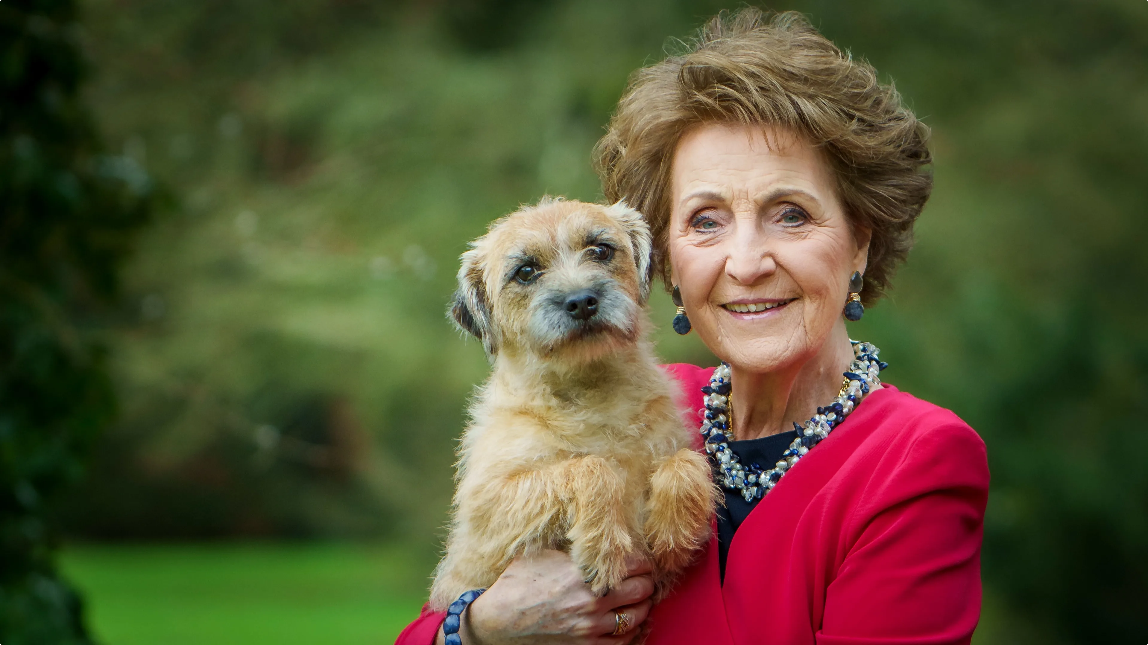Op twee van de drie foto's houdt Margriet haar hondje Boogiewoogie, een borderterriër, vast in haar armen. De borderterriër is altijd al in trek geweest bij de koninklijke familie: zowel Margriet als prinses Beatrix hebben er een paar gehad.