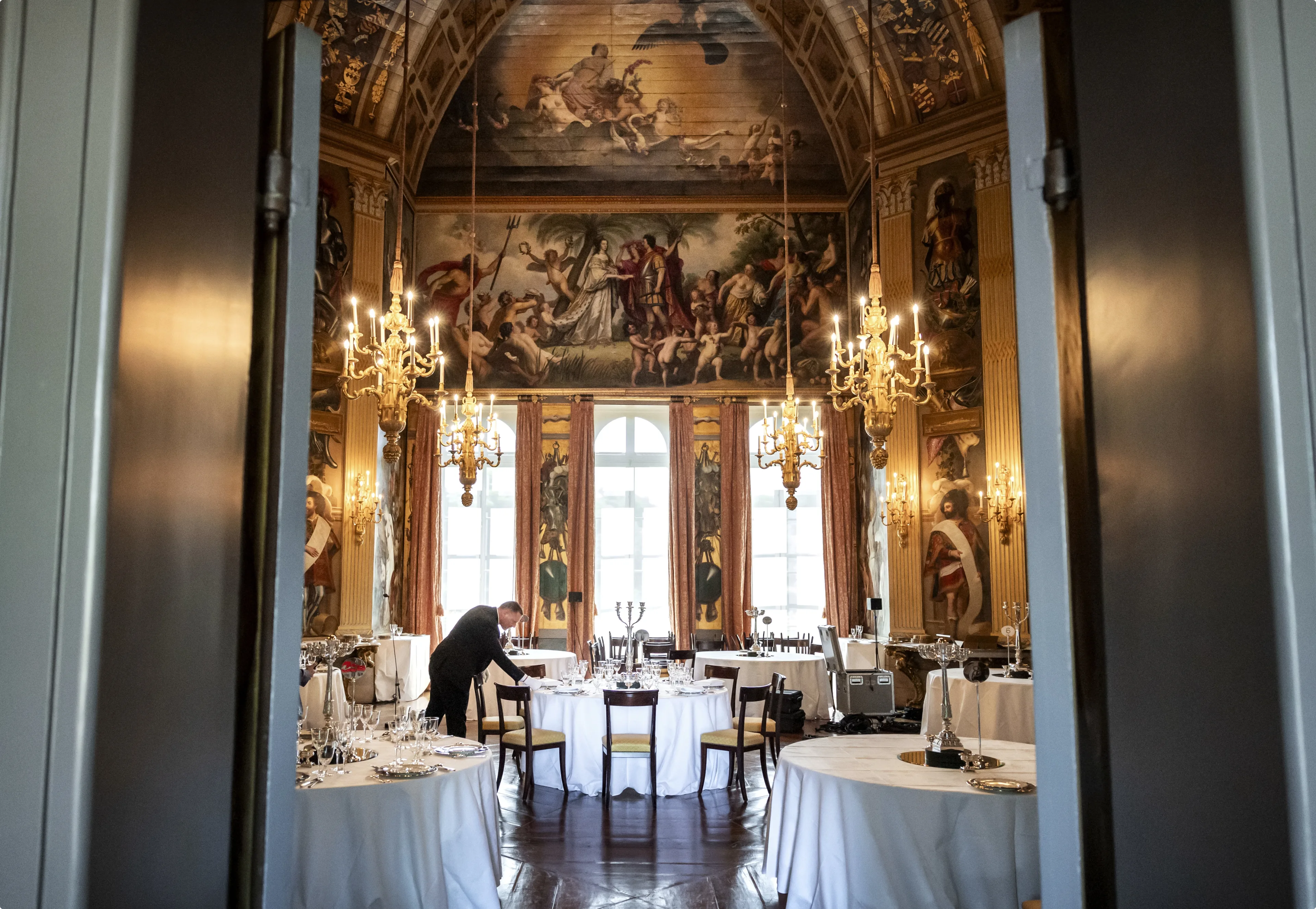 Op foto's van de voorbereidingen is te zien dat de gasten dinsdagavond aan ronde tafels komen te zitten en dat er gegeten wordt van het Delfts blauwe Blossom Panache-servies.