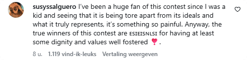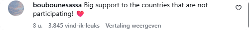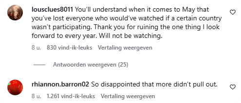 "Grote steun aan de landen die niet deelnemen!", schrijft iemand. Weer een ander schrijft: "De manier waarop je alle kritiek volledig negeert, omdat het voor jou beter is om Israël te laten meedoen dan om een aantal landen te verliezen. Verenigd door een schaamteloos gevoel."