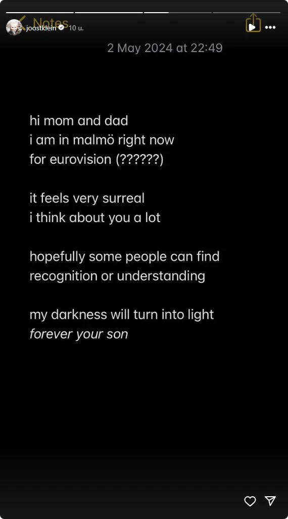 Op zijn Instagram-verhaal plaatst hij een screenshot van een bericht dat hij heeft opgesteld in zijn notities: "Hallo mama en papa", begint Joost zijn bericht. "Ik ben nu in Malmö voor het Eurovisiesongfestival. Het voelt erg surrealistisch. Ik denk veel aan jullie. Hopelijk kunnen sommige mensen erkenning of begrip vinden. Mijn duisternis zal in licht veranderen. Voor altijd jullie zoon."