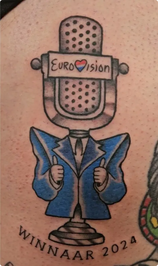 Op het social medium X gaat een foto van influencer Young Petsi viral. Hij liet voordat de diskwalificatie bekend werd 'Winnaar 2024' tatoeëren bij een afbeelding van het pak van Joost met een Eurovisie-microfoon als 'hoofd'. Andere gebruikers van X maken daar nu '2025' van.