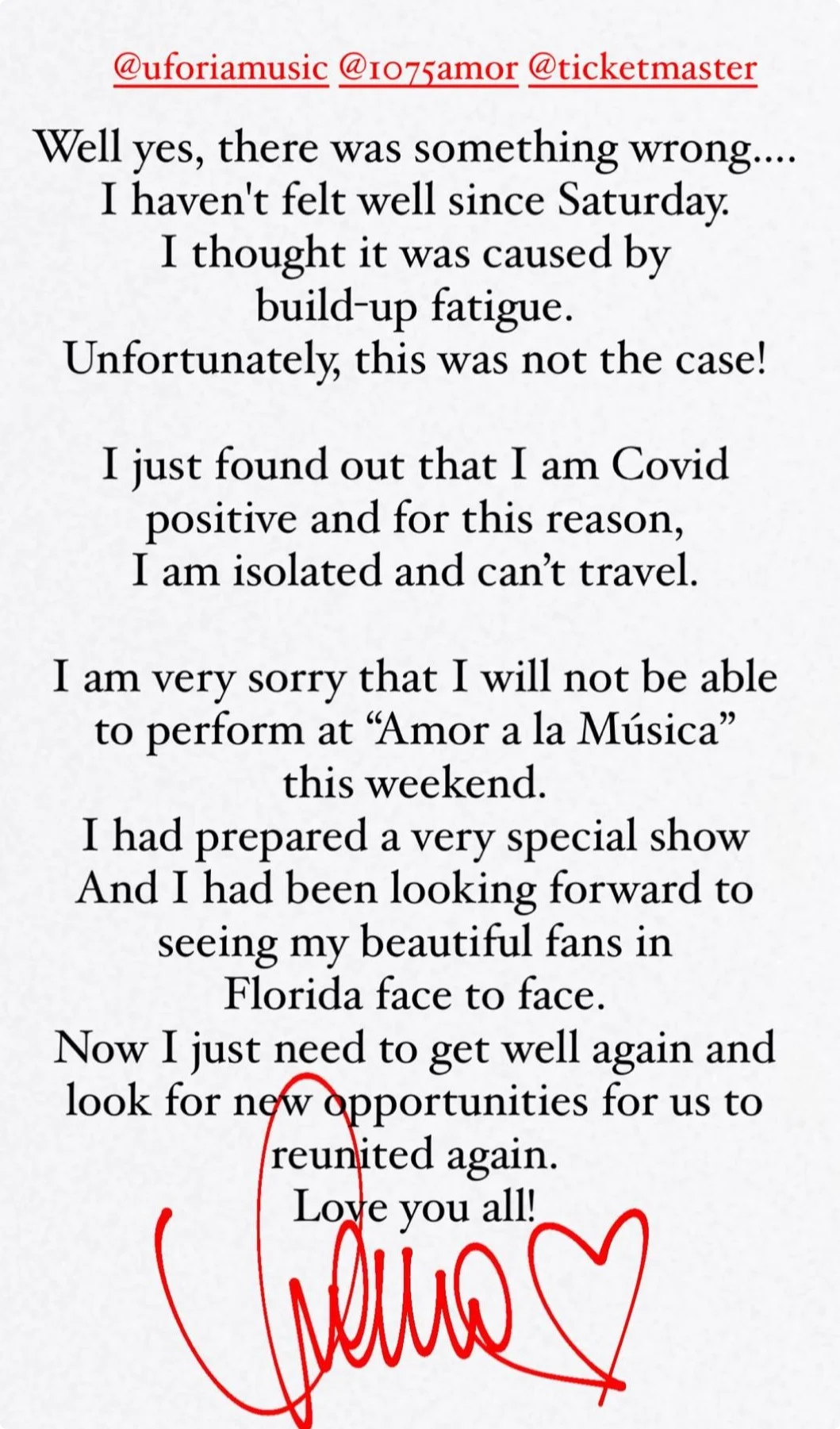 "Nou ja, er was dus toch iets mis", geeft Pausini nu aan. "Ik voel me sinds zaterdag niet lekker. Ik dacht dat het kwam door de vermoeidheid maar ik ben er net achter gekomen dat ik corona heb." Vanwege haar positieve test zit Pausini nu in isolatie en mag ze niet reizen. Daardoor mist ze een optreden in Florida.
