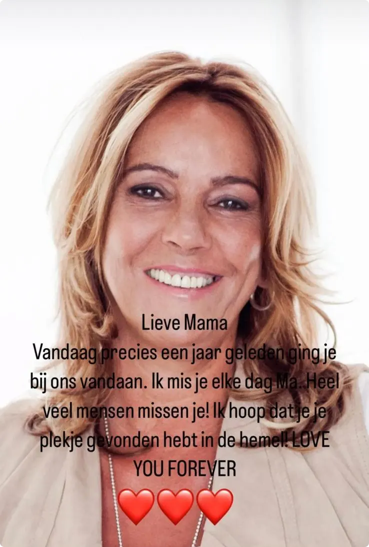 De moeder van Wesley is namelijk precies een jaar geleden overleden. Daar staat hij emotioneel bij stil op sociale media. Bij een foto van zijn moeder schrijft Wesley: "Lieve mama, vandaag precies een jaar geleden ging je bij ons vandaan. Ik mis je elke dag ma. Heel veel mensen missen je! Ik hoop dat je je plekje gevonden hebt in de hemel! LOVE YOU FOREVER."