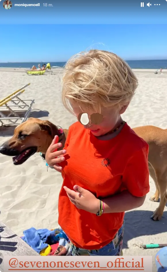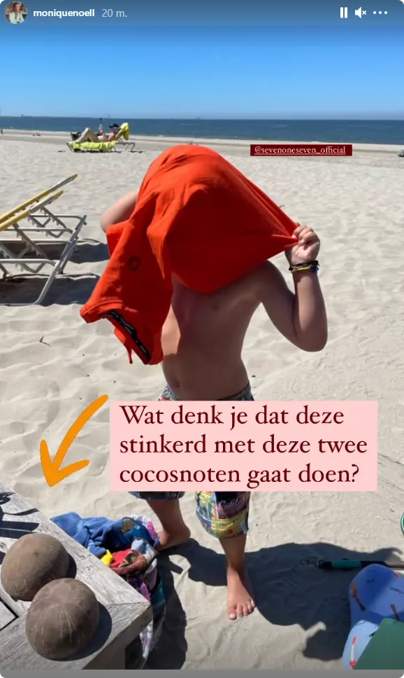 Monique deelt foto's van haar zoontje op het strand met twee kokosnoten. "Wat denk je dat deze stinkerd met deze twee kokosnoten gaat doen?" schrijft ze bij de eerste foto.