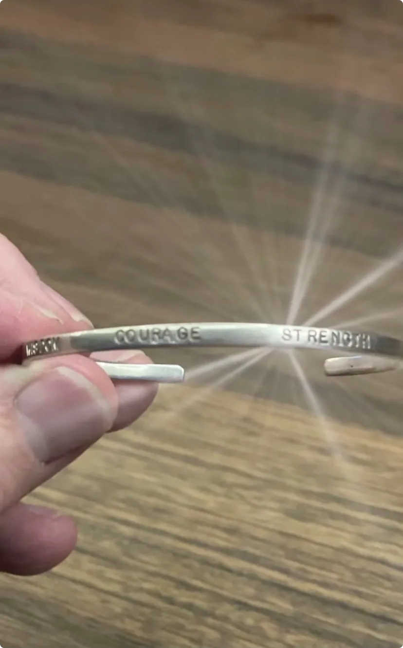 Op het kiekje is een chique armband te zien. De woorden 'wisdom', 'courage' en 'strength' staan in het sieraad gegraveerd. De Nederlandse vertaling daarvan is: 'wijsheid', 'moed' en 'kracht'. Bijzondere en passende woorden voor de zanger. Hij gaat op dit moment door een moeilijke tijd, vanwege de scheiding met Leontine.