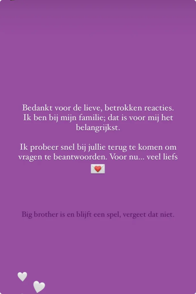 Chiara begint: "Bedankt voor de lieve, betrokken reacties. Ik ben bij mijn familie; dat is voor mij het belangrijkst". Waarna ze vervolgt: "Ik probeer snel bij jullie terug te komen om vragen te beantwoorden. Voor nu veel liefs." Chiara sluit haar bericht af door te reageren op de gekregen kritiek: "Big Brother is en blijft een spel, vergeet dat niet.