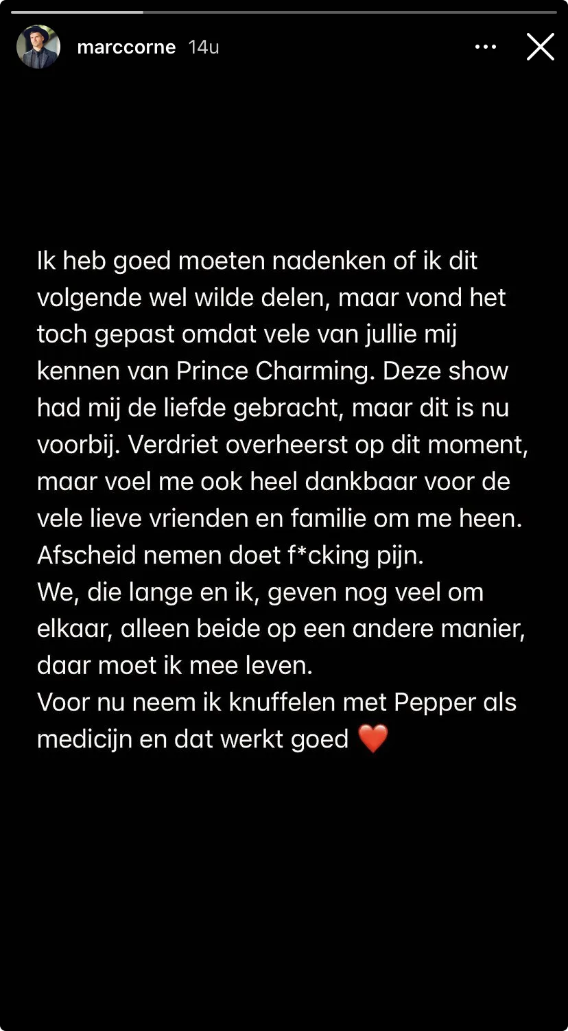 "Ik heb goed moeten nadenken of ik dit volgende wel wilde delen, maar vond het toch gepast omdat velen van jullie mij kennen van Prince Charming", aldus Marcel in zijn Instagram Stories. "Deze show heeft mij de liefde gebracht, maar dit is nu voorbij."
